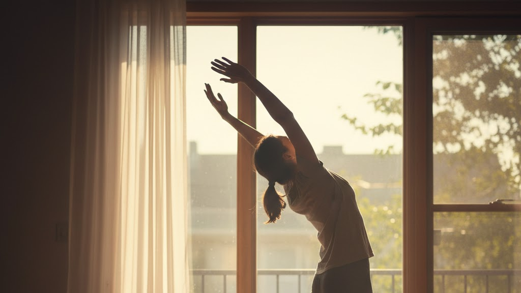 • opening the window and stretching toward the morning sun